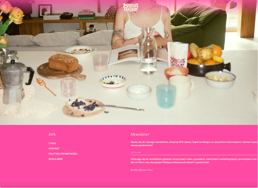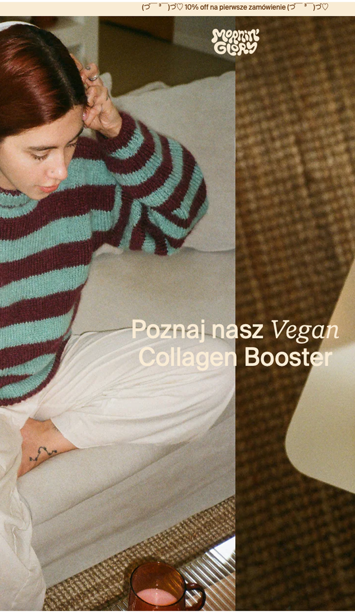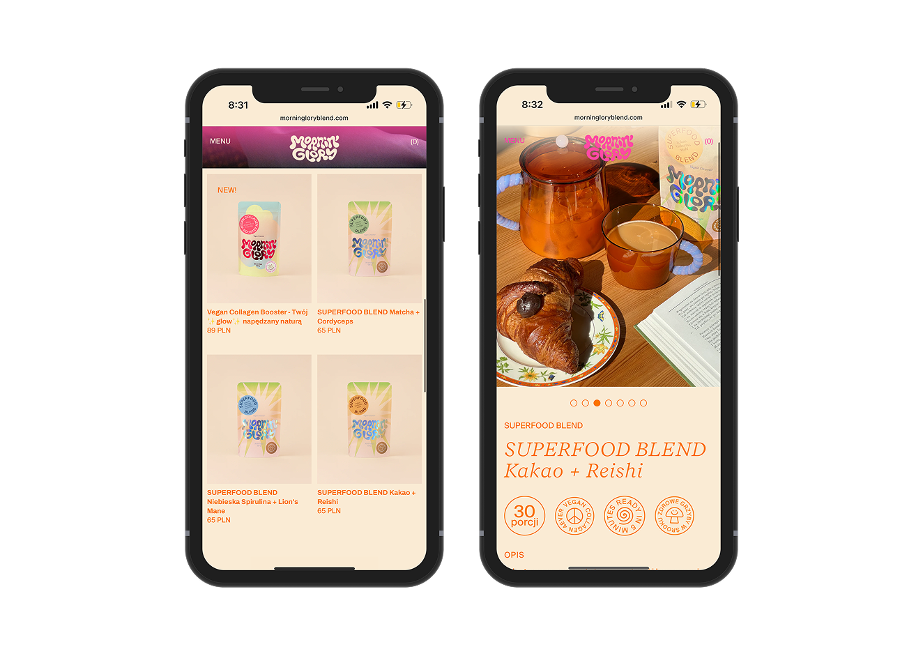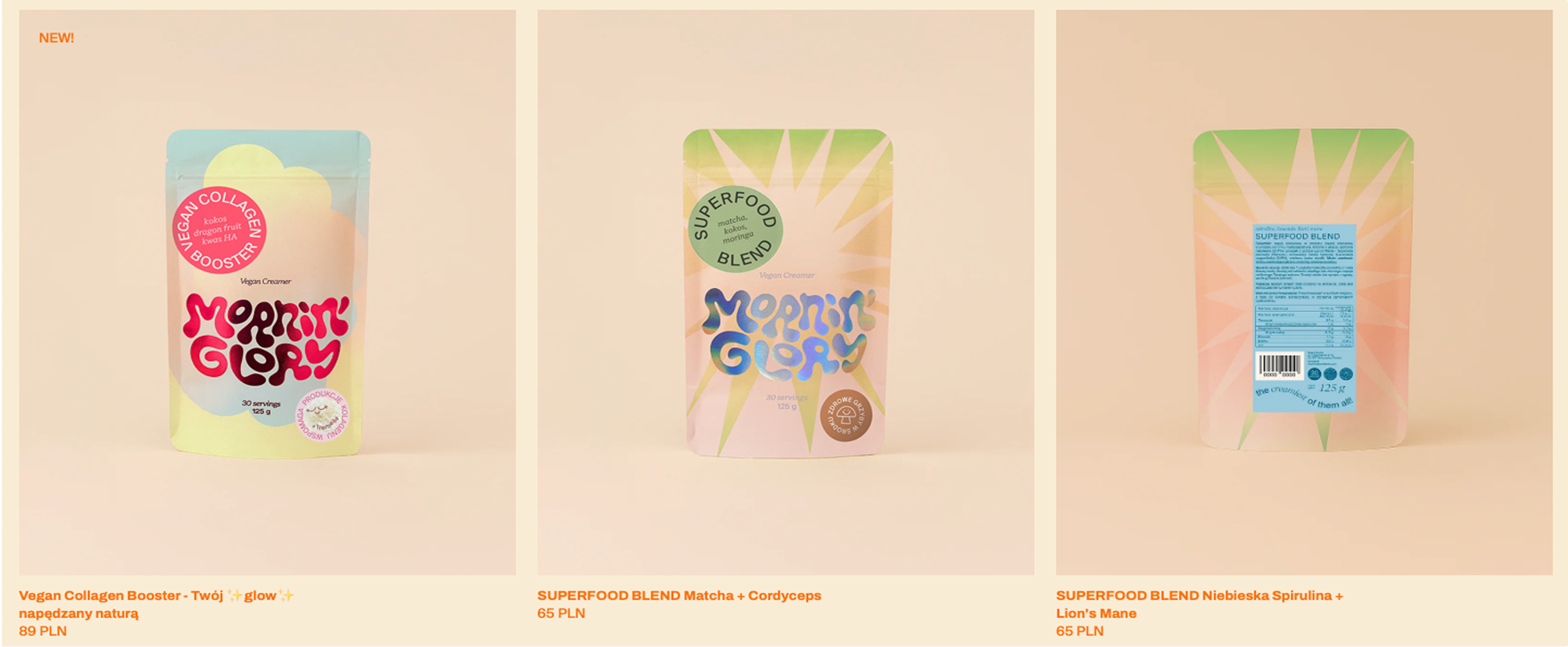 Morning Glory is a Polish wellness brand that invites people to begin their day gently. Their blends from vegan collagen boosters to superfood mixes are created to be simple, natural, and joyful additions to everyday routines. The brand has a warm, analogue visual universe: pastel gradients, nostalgic typography, cosy lifestyle photography, and a tone that feels personal and unhurried. Their world lives somewhere between comfort and creativity